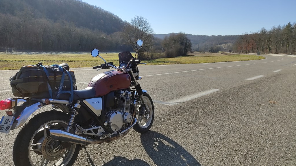 J’ai l’impression de retourner en Californie sur la route côtière. Je laisse vite le souvenir derrière mois pour me concentrer et m’en créer de nouveaux, à l’aube de cette nouvelle année. Qu’il fait chaud dans le sud. Pas étonnant que la région soit si sèche. Et je n’ose pas imaginer la situation ailleurs, en Provence notamment. J’arrive très vite, peut-être trop, dans le Tarn-et-Garonne. Il faut dire qu’il était tentant de donner des petits coups de gaz pour remonter les côtes. Le changement de décor s’annonce et je décide d’une pause à Montauban pour faire tomber, non pas la chemise, mais le pantalon d’hiver et remettre un pantalon d’été. Toujours renforcé et protecteur, n’allez pas imaginer que je roule en jean, claquette-chaussette. Je n’ai pas de scrupule à effectuer cette transition dans les toilettes du Mcdo de la zone industrielle. Après tout, n’ai-je pas déjà enfreint ma propre règle de ne pas y consommer, après avoir pris deux pauses café au sein de leurs franchises, en Normandie puis en Haute-Vienne ? Qu’il est agréable de ne plus porter de couche épaisse et lourde. Je pense même à enlever mon pull pour m’aérer totalement. Enfin, pas à finir en sous-vêtements non plus.