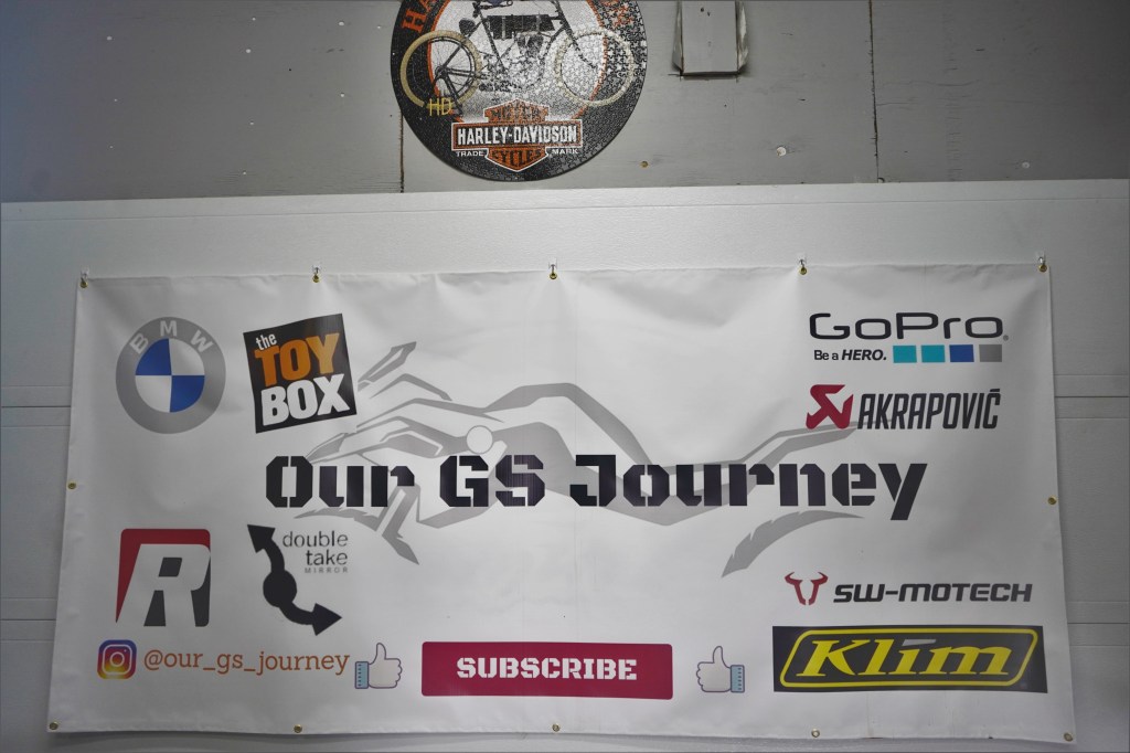 To enter Patrick and Robyn’s home is to enter a world. And not just any world, but that of Harley Davidson. In the garage, I’m greeted by a playlist of ACDC competing with Led Zeppelin, and I watch helplessly as Patrick laughs at my wide eyes: « We may have five bikes, but we don’t have kids! » From the epoxy floor stained grey and white orange to the ceiling and walls, everything exudes the American brand. The walls are covered with pictures of several iconic models and two gleaming Harleys are perfectly positioned next to each other. And it’s almost incongruously that my gaze is drawn to the closed garage door, where a huge Our GS journey banner is hung, representing the name of the YouTube channel launched by the couple. Indeed, Patrick and Robyn may be passionate about Harley Davidson, but they are above all passionate about motorcycles, including motorcycle adventures. It goes without saying that each owns a BMW GS, Robyn’s 750, Patrick’s 850.