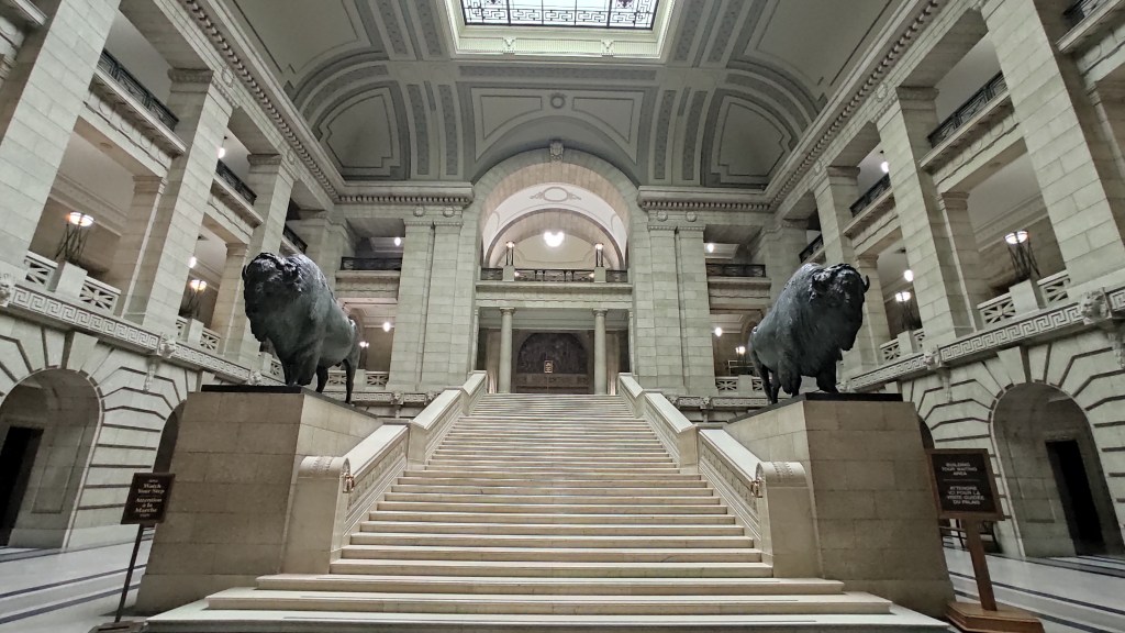 Fun fact : l’emblème du Manitoba est un bison, c’est lui que vous retrouvez notamment sur les plaques minéralogiques de chaque véhicule immatriculé là-bas. Le bison était l’animal qui pourvoyait les besoins des Premières nations : nourriture, vêtement, outil. Des milliers pâturaient les plaines de la province mais la colonisation a presque anéanti l’espèce. On en comptait une centaine seulement à la fin du 19ème siècle. Deux statues de l’animal encadrent également l’escalier du Palais législatif (Assemblée législative du Manitoba), à Winnipeg. La légende dit qu’ils se nomment Mani et Toba. A vérifier.